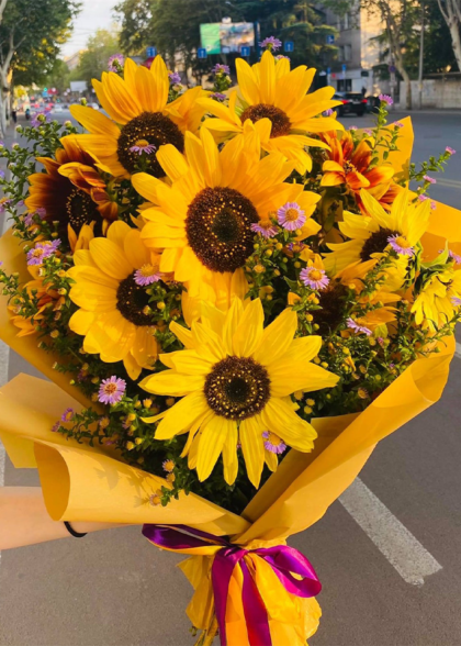 შემადგენლობა: 10 მზესუმზირა და სექტემბერები ერთმაგი შეფუთვა კომპოზიციაში შესაძლებელია შეიცვალოს ყვავილის ტიპი, ფერი და შეფუთვა. თუ გსურთ მიიღოთ დეტალური ინფორმაცია, გთხოვთ, დაგვიკავშირდეთ ნომერზე: 598…